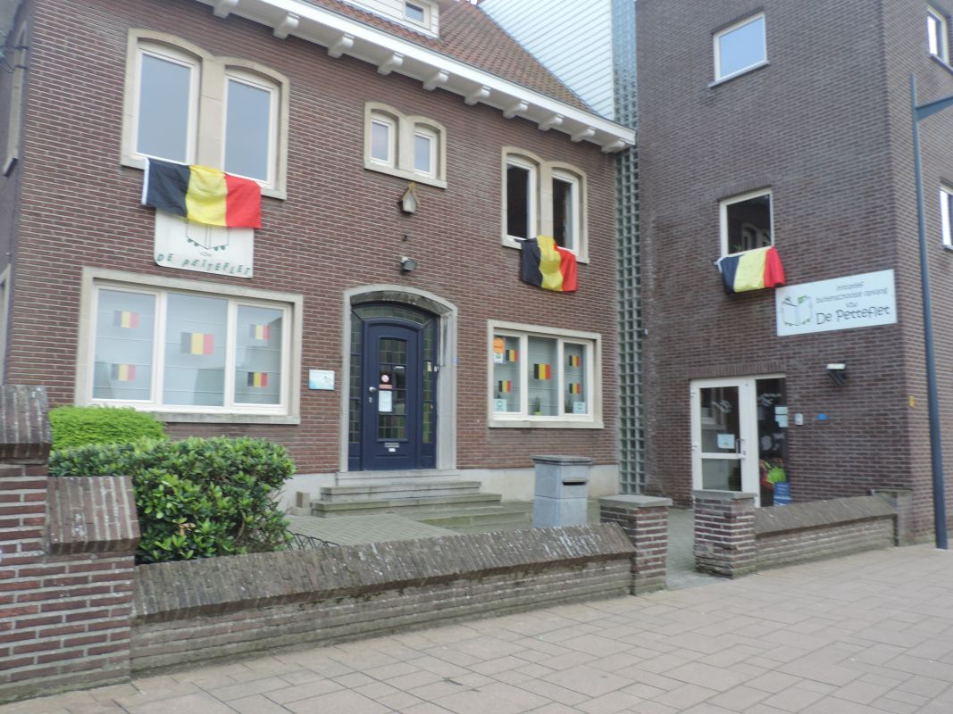 De Rode duivels zijn te volgen op het grote scherm in de cafetaria die volledig in de Belgische driekleur getooid is.